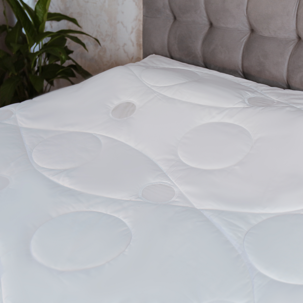 Круглые вентиляционные вставки, расположенные по всей поверхности одеяла в определенном порядке, за счет округлой формы с сетчатой структурой эргономично прилегают к частям тела, способствуя охлаждению данных участков. Попадая в способное пространство, вентиляционные вставки выводят излишнее тепло.
